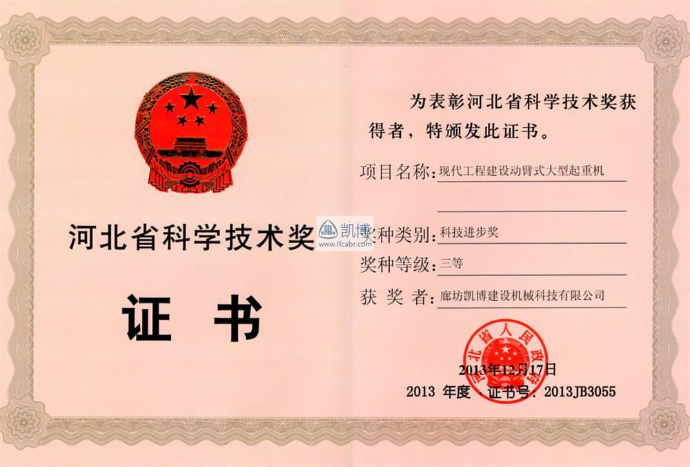河北省科學技術獎三等獎 現代工程建設動臂式大型起重機